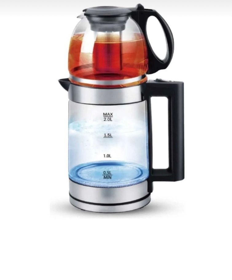 Bu çay makinesi, üzerindeki 1.5 litrelik cam demliği ve 2 litrelik su ısıtıcısı ile su seviyelerini gösteren ölçü işaretlerine sahiptir. Gri ve mavi renklerdedir. ☕