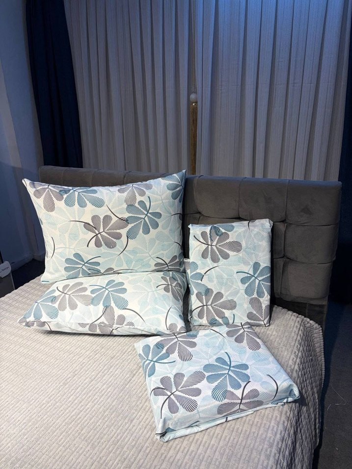 Gri ve mavi tonlarda çiçek desenli modern kırlent kılıfları, mekâna ferah bir dokunuş katar. /100 pamuklu