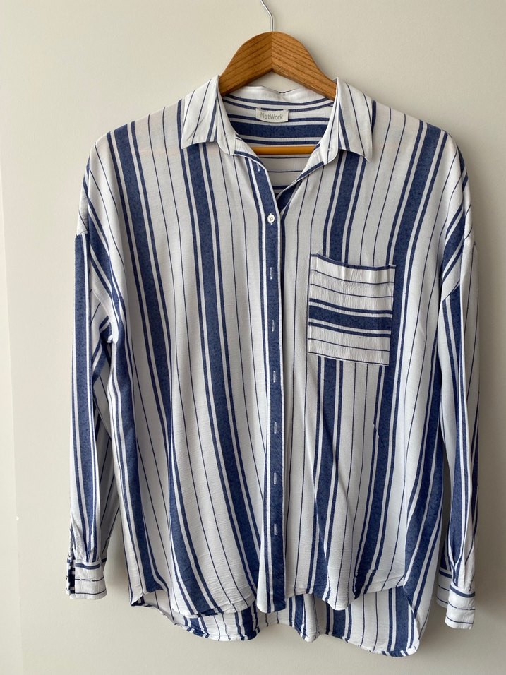 Pamuklu, uzun kollu, düğmeli, yakalı, gri mavi çizgili kadın gömlek. Rahat kesimiyle günlük kullanıma uygundur.