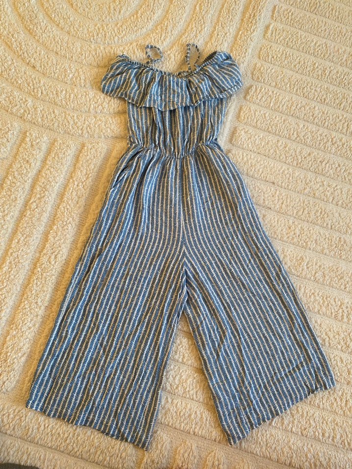 Volanlı detaylı, askılı, straplez yakalı, bol kesim uzun tulum. Yumuşak keten kumaştan, mavi ve gri çizgili desenli, bohem tarzda. Paçaları diz altı boyda