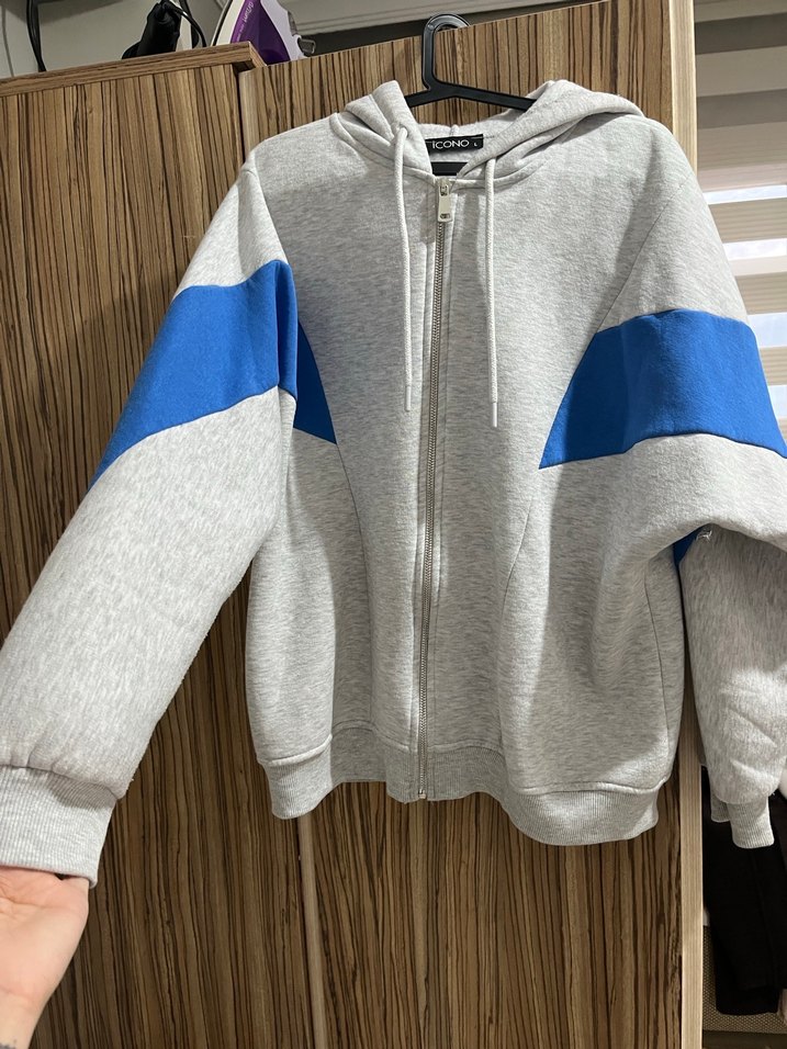 Kadınlar için gri renkli, mavi şerit detaylı, uzun kollu ve fermuarlı sweatshirt. Rahat kesimi ve yumuşak kumaşıyla günlük kullanıma uygundur.