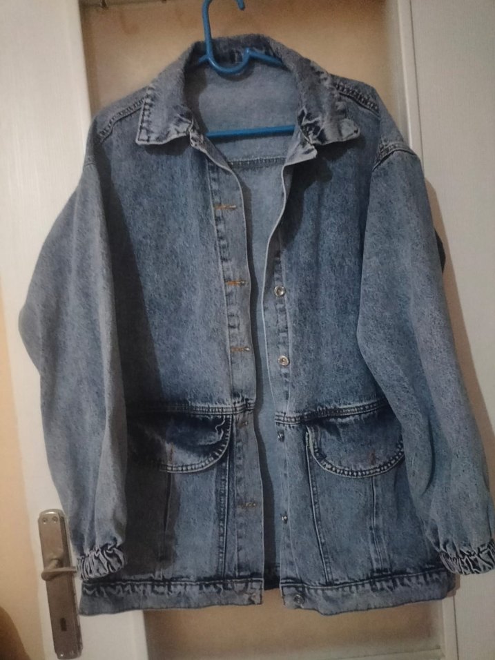 Düğmeli, bol kesim ve uzun kollu kadın denim ceket. Notlu yaka ve iki ön cepli, gündelik kullanıma uygun gri mavi renkte.