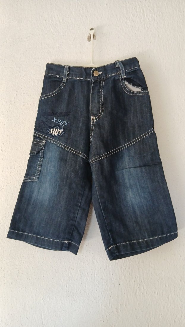 Bol kesim, kot kumaştan yapılmış, mavi ve gri tonlarında erkek çocuk pantolonu. 'SUT' ve 'X25X' nakış detaylı, tokalı tasarıma sahip.