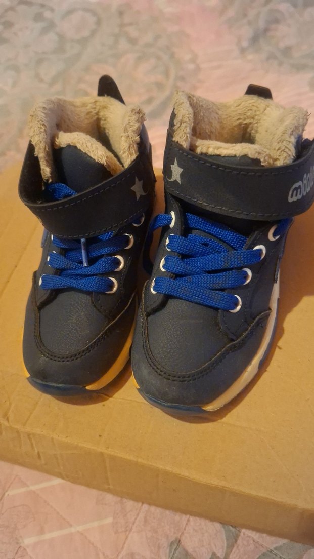 Mavi ve gri renkli, velcro bağlamalı, kauçuk tabanlı erkek çocuk botları. Yumuşak ve sıcak astarlı, sokak stiline uygun.