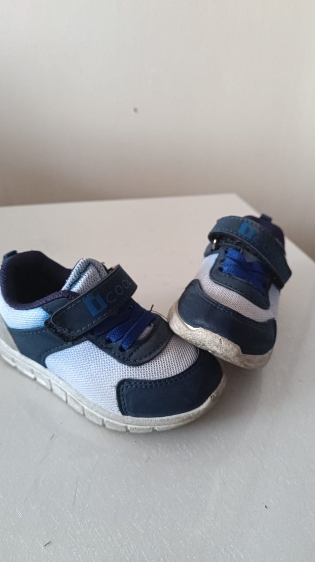 Gri ve mavi tonlarında, lastik tabanlı ve cırt cırtlı bağlamaya sahip erkek çocuk spor ayakkabısı, sokak stiline uygun.