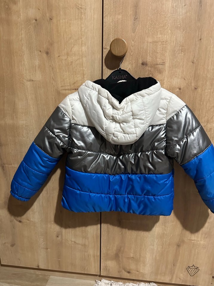 Gri, gümüş ve mavi renk bloklu, kapüşonlu ve yumuşak sıcak kumaştan erkek çocuk montu. Fitted kesim ve rahat tasarım sunar.