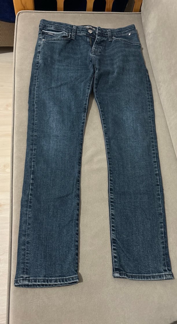 Gri mavi tonlarda, normal boy ve regular fit kesime sahip, dayanıklı denimden erkek kot pantolon. Tokalı detay içerir, günlük rahat kullanıma uygundur.