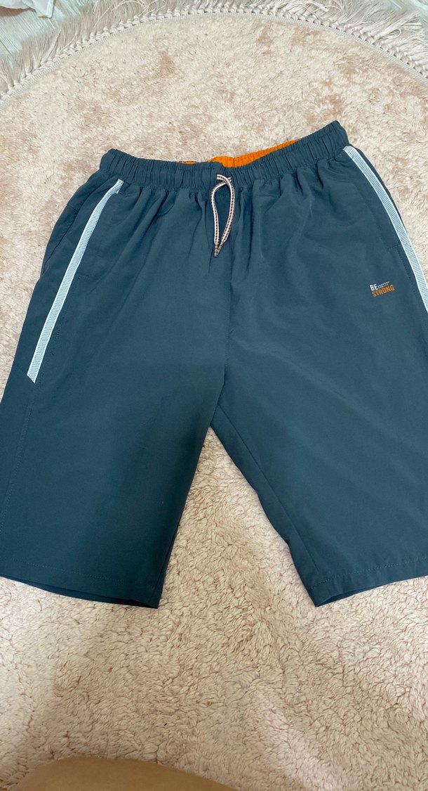 Gri renkte, cepli ve lastikli beli olan bol kesim erkek deniz şortu.