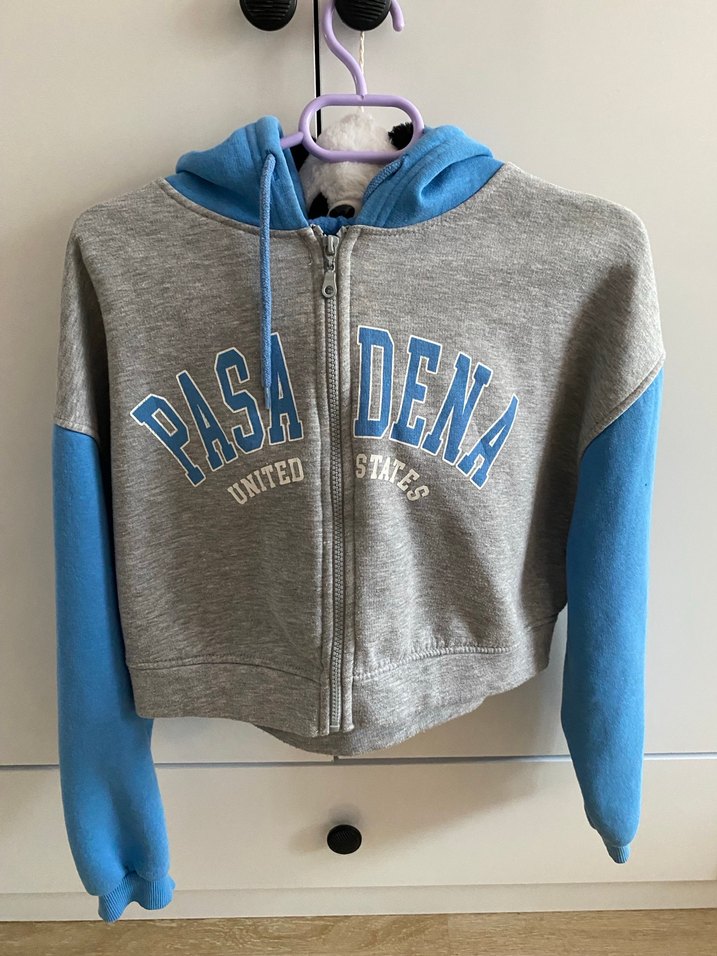 Fermuarlı, uzun kollu, bisiklet yaka kadın sweatshirtü. Gri ve mavi tonlarında, 'PASADENA UNITED STATES' baskılı, midi boy ve dar kesimdir.