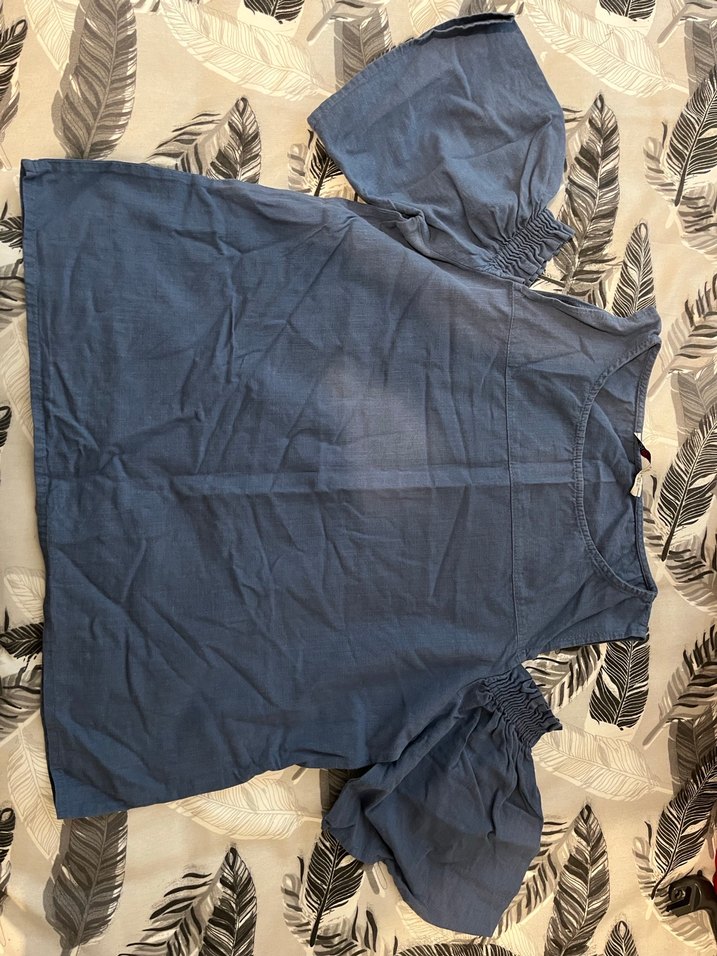 Gri mavi renkte, bol kesim hamile bluz. Keten kumaştan, tek renklidir. Kısa, drapeli kolları ve kayık yaka detayı vardır. Işık kaynaklı leke var gibi görünüyor.
