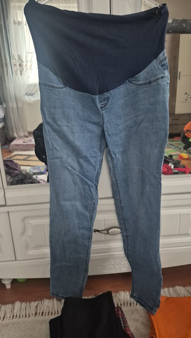 Gri mavi renkte, kot kumaştan, bol kesim ve tokalı hamile pantolonu, günlük kullanım için uygun.