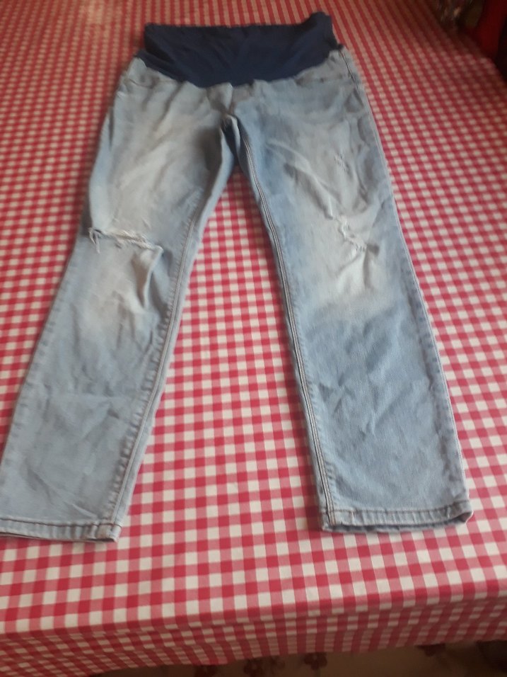 Gri mavi renkte, bol kesim hamile kot pantolon. Rahat elastik bel bandı ve günlük kullanıma uygun casual tarz.