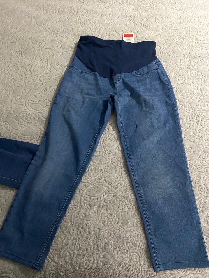 Gri mavi tonlarında, bol kesim ve normal boyda, rahat destek sağlayan esnek bel bandına sahip hamile kot pantolon.hiç giyilmedi terzi işlemi var bana kısa geldi iç bacak ölçüsü fotografta mevcut