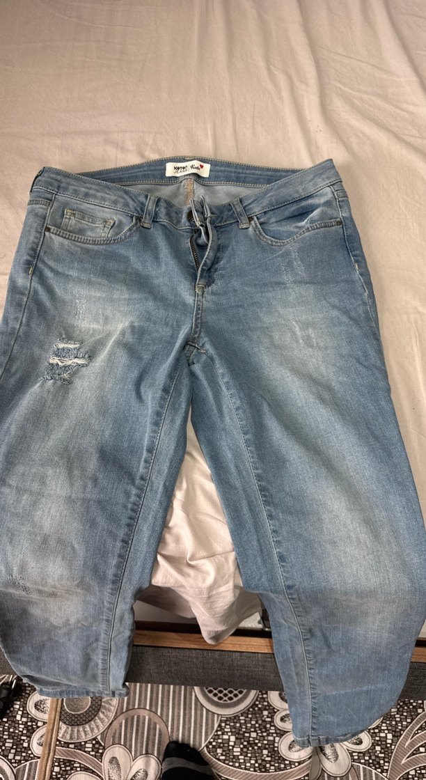 Dar kesim, orta boy, tokalı kadın kot pantolon, sol bacakta hafif yıpranma detayıyla gündelik sokak stiline uygun.