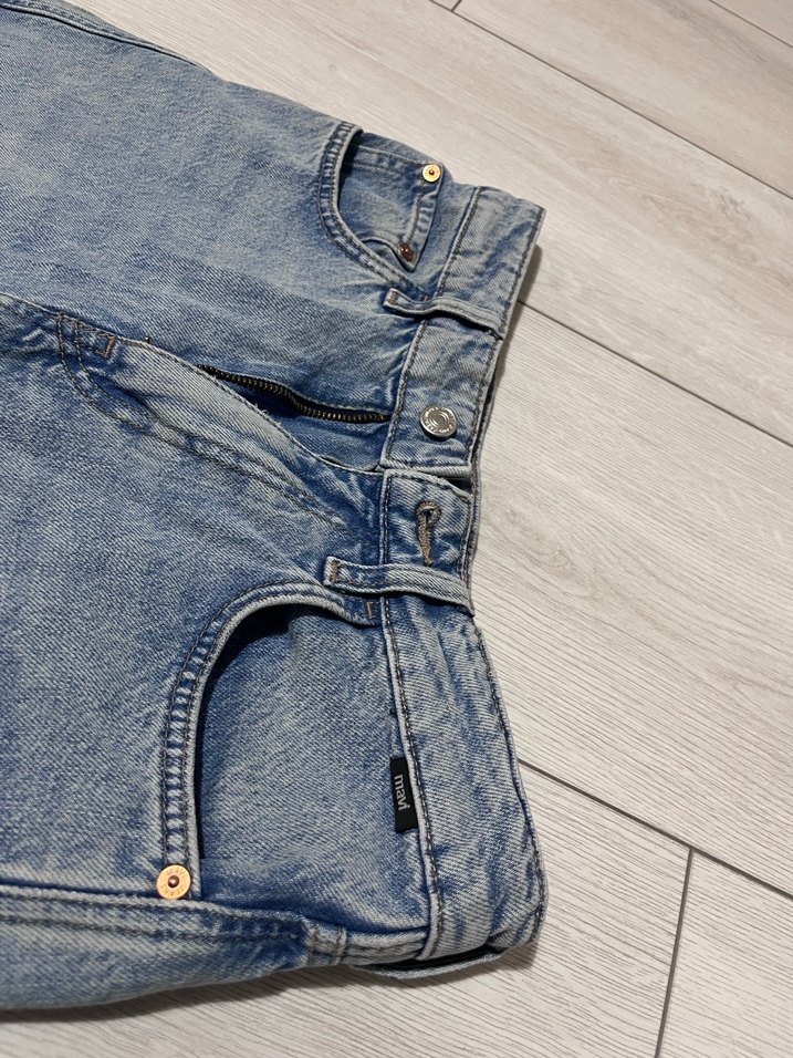 Gri mavi renkte, bol kesim, fermuarlı ceplere sahip kadın denim pantolon. Normal boyda, desen içermeyen rahat bir model.