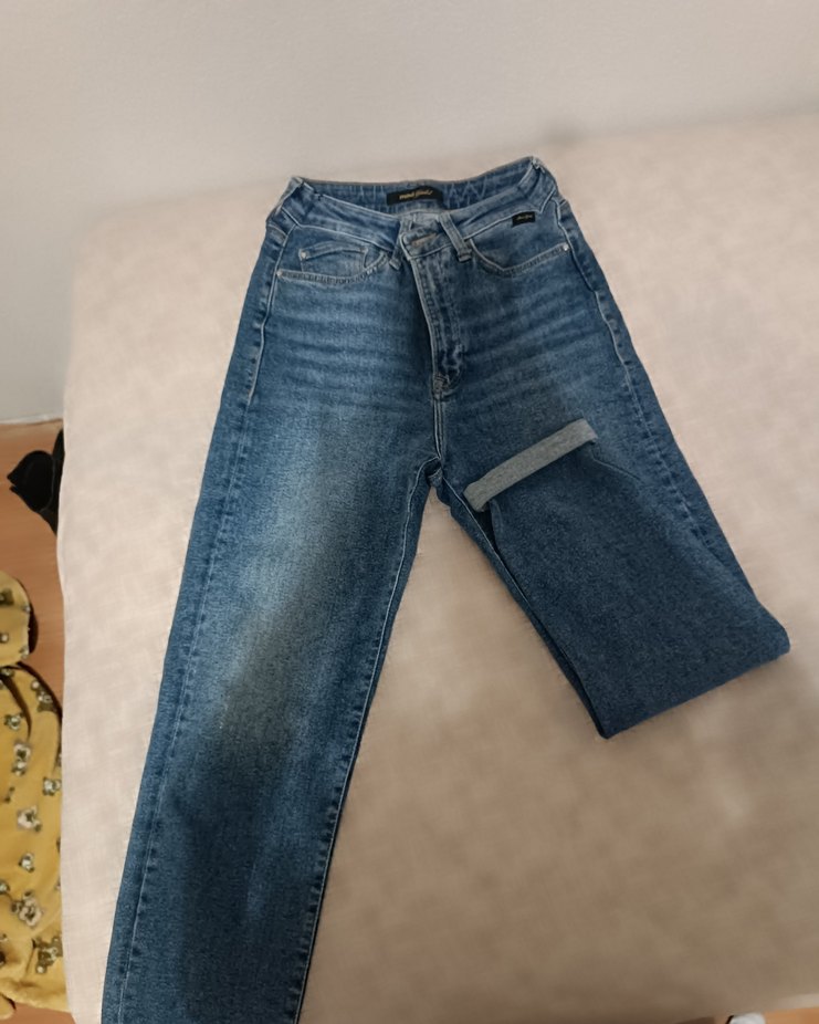 Gri mavi renkte, regular fit kesim kadın denim kot pantolon. Tokalı detaya sahip, midi boy ve desensiz, günlük kullanıma uygun.