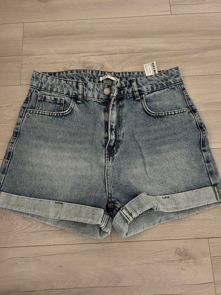 Gri mavi renkli, bol kesim ve katlamalı kenar detaylı denim mini şort, günlük kullanım için rahat ve şık bir tercih.