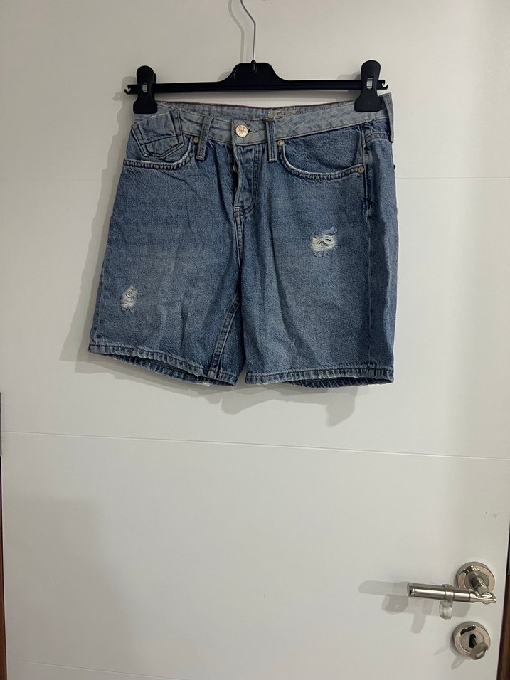 Gri mavimsi tonlarda, hafif yıpratma detaylı, bol kesim mini denim şort, rahat ve günlük sokak stili için uygundur.