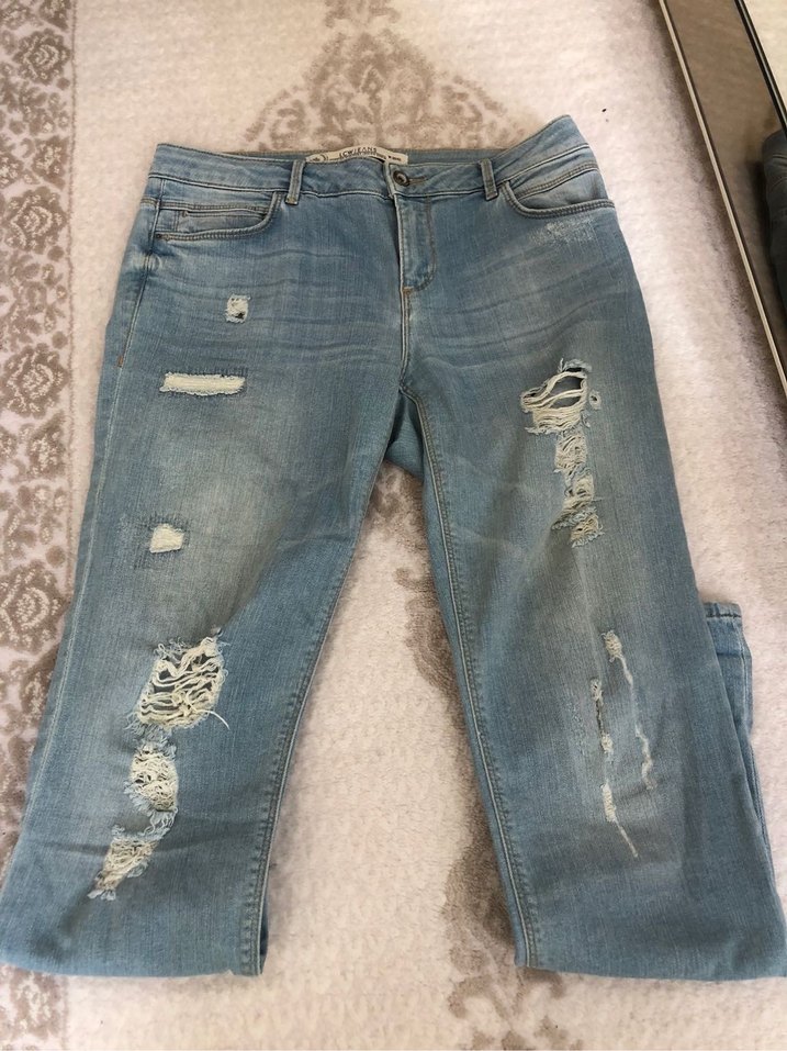 Gri-mavi tonlarında, rahat kesim kadın denim pantolon. Yıpranmış detaylara sahip, normal boy ve desensiz, günlük kullanıma uygun. 30/40 bedendir