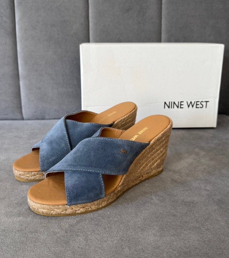 Gri mavi süet bantlara sahip, hafif desenli ve tokalı kadın dolgu topuklu terlikler. Doğal dokuma dolgu topuk, günlük şıklık sunar. Marka: Nine West.