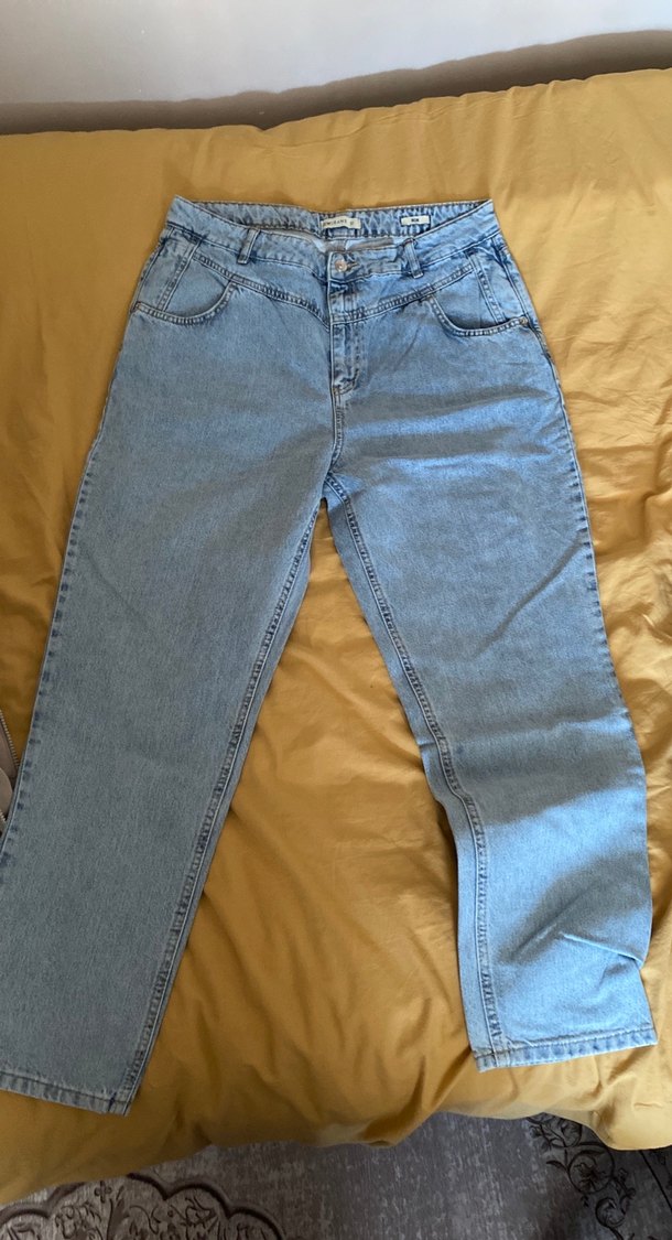 Gri mavi tonlarda, salaş kesim ve midi boyda kadın kot pantolon. Desensiz, günlük kullanıma uygun rahat ve şık bir model.