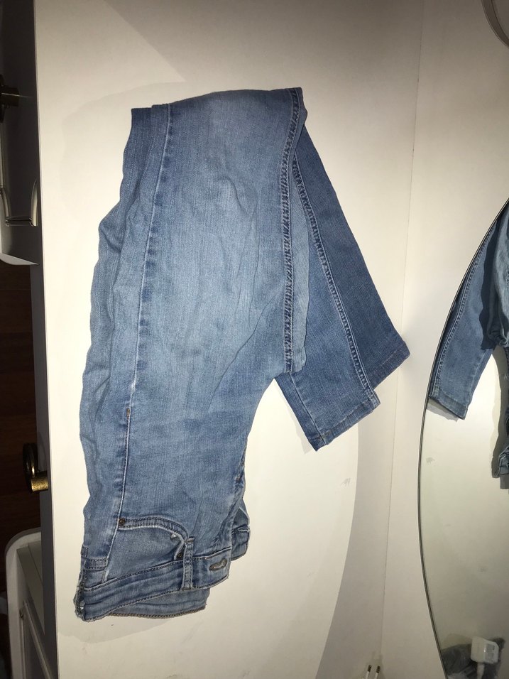 Gri mavi renkte, kemerli ve midi boyda, dar kesim kadın kot pantolon. Sokak stiline uygun rahat bir parça.
