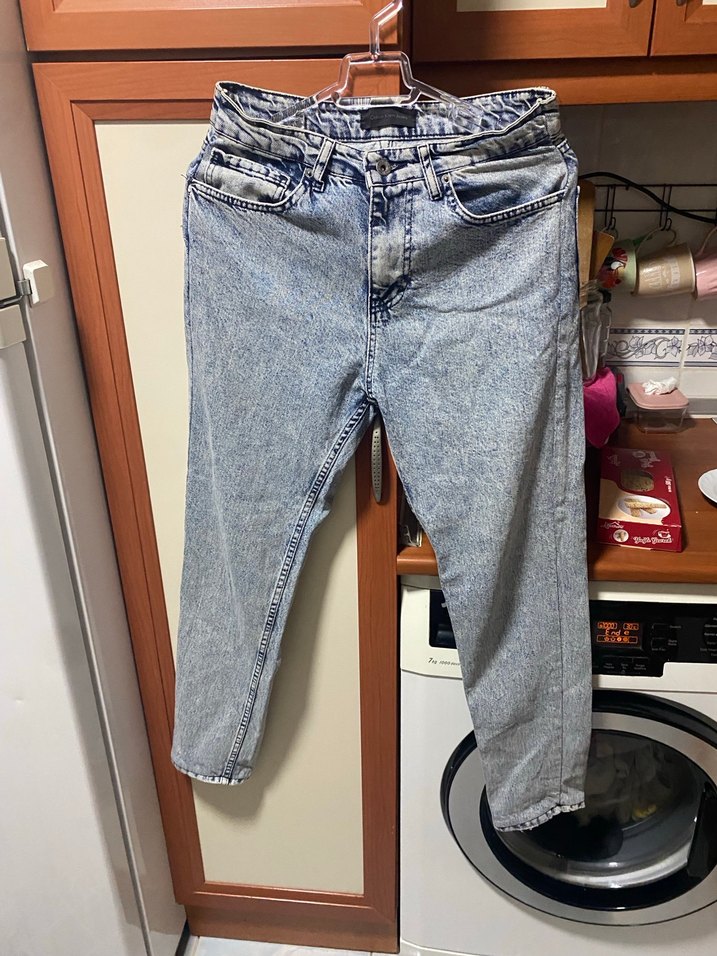Gri mavi renkte, geniş kesim ve midi boy kadın kot pantolon. Desensiz, günlük kullanıma uygun rahat bir tarza sahiptir.