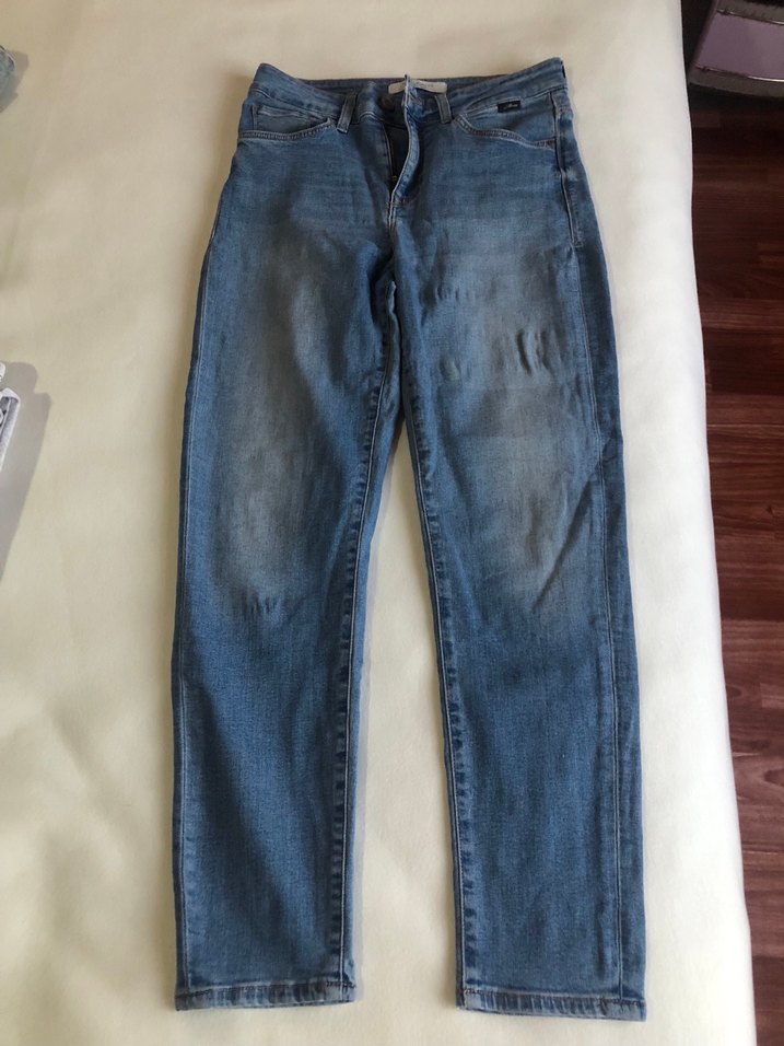 Gri mavi renkte, midi boy ve bol kesim kadın denim pantolon.