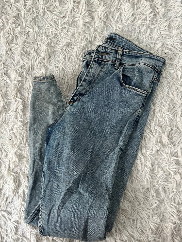 Gri mavi tonlarda, kürk detaylı, salaş kesim kadın kot pantolon. Midi boy ve günlük sokak stili için uygun.