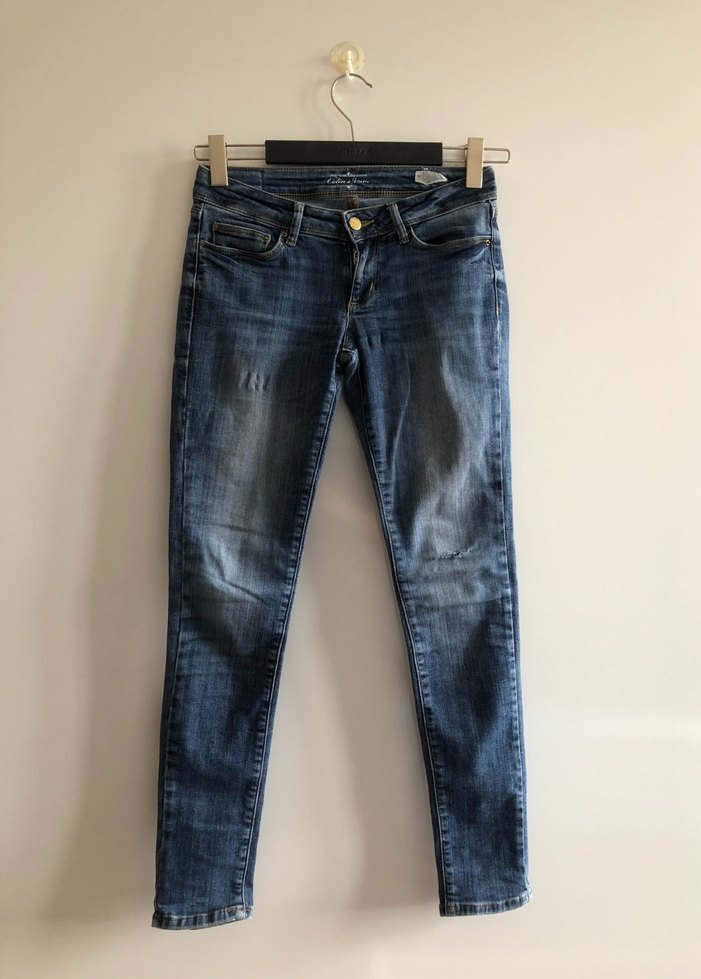 Gri mavi renkte, slim fit kesim ve normal boyda kadın denim pantolon. Günlük kullanıma uygun, sade ve tokalı detaylıdır.