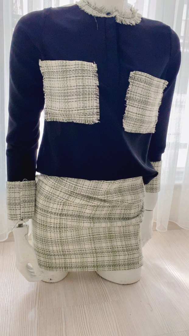 Kadınlar için düzenli kesim, uzun kollu ve yuvarlak yakalı bu takım, kısa kareli mini etek ve triko detaylı cepler ile çağdaş Paris tarzını yansıtır. Tüm bedenler mevcuttur