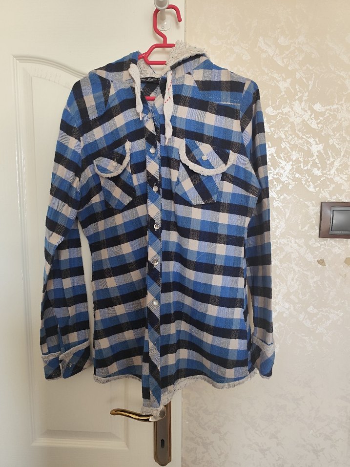 Pamuklu, düğmeli, uzun kollu, gri mavi kareli desenli, salaş kesim kadın gömlek. Yaka detaylı, günlük ve rahat stil için uygundur.