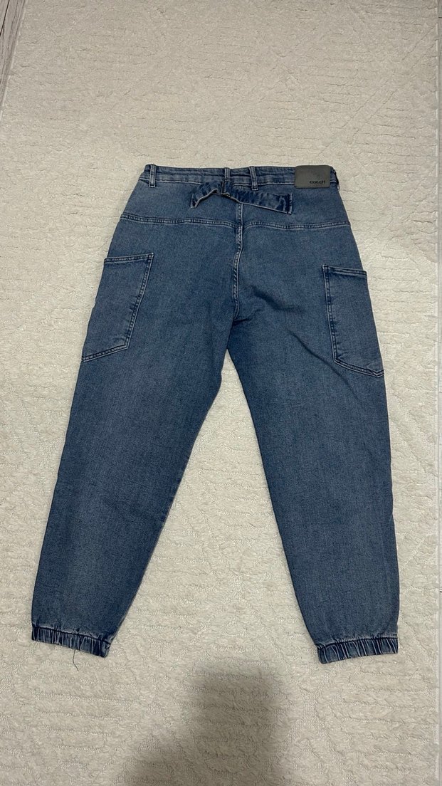 Erkekler için bol kesim, kemerli ve normal midi boy kot pantolon. Düz mavi-gri renkte, günlük rahat kullanım için uygundur. Ayak bileği lastiklidir.