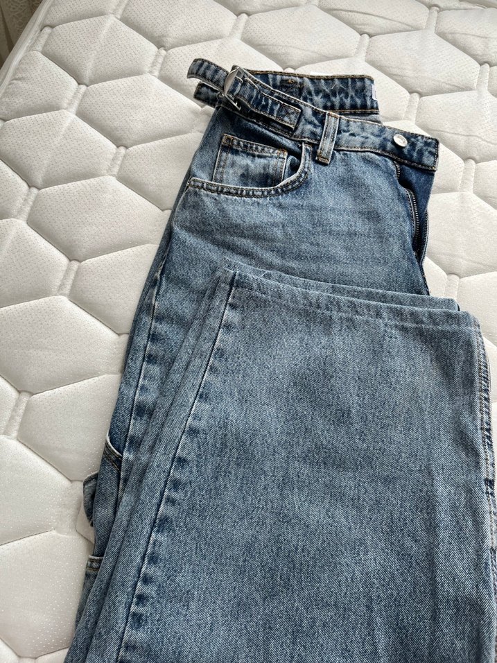 Gri mavi tonlarında, kemerli, bol kesim, midi uzunlukta kadın denim pantolon. Günlük rahat kullanım için uygundur.