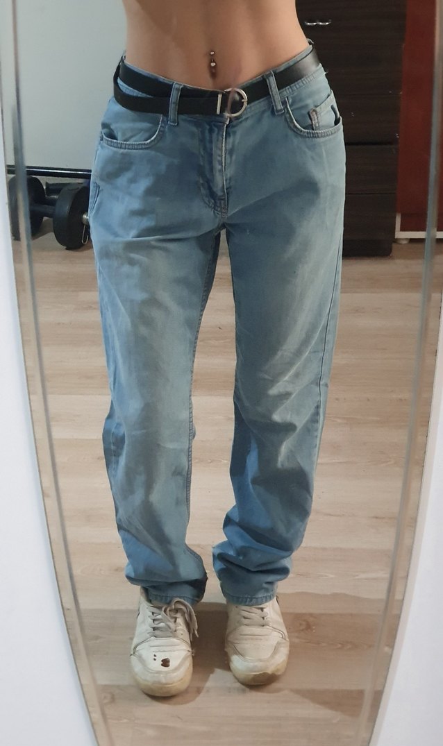Gri-mavi tonlarında, loose fit midi uzunlukta kadın kot pantolon. Günlük rahat sokak stili için uygun, sade ve kullanışlı.