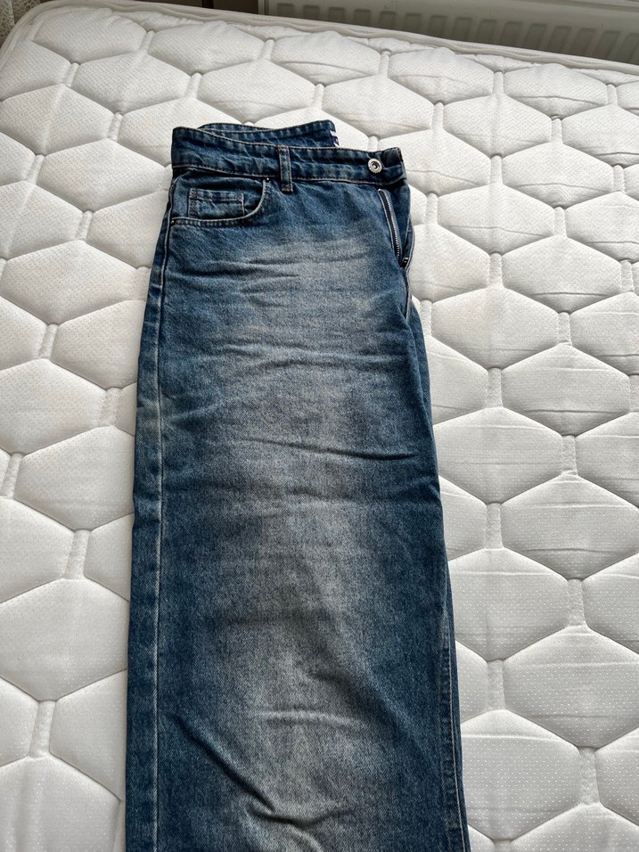 Günlük kullanıma uygun, kemerli ve rahat kot kumaştan yapılmış, bol kesim midi uzunluğunda kadın kot pantolon.