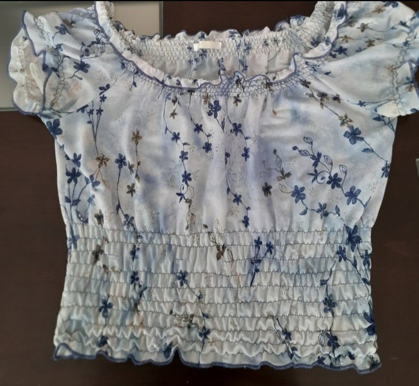 Gri ve mavi tonlarda, nakışlı çiçek desenli, kısa boylu, bol kesim, tekne yaka ve kısa kollu bohem tarzda bluz. Fırfır detayları bulunur. Nakışlı çiçek desenleri, fırfırlı detaylar ve kayık yaka ile mavi bohem bluz. Kısa kollu, uzun ve bol kesim rahat bir tarz sunar. Adil Işık marka, S beden, ince kumaştır. Beli 36 cm, yakası açık ve geniş 32 cm dır.