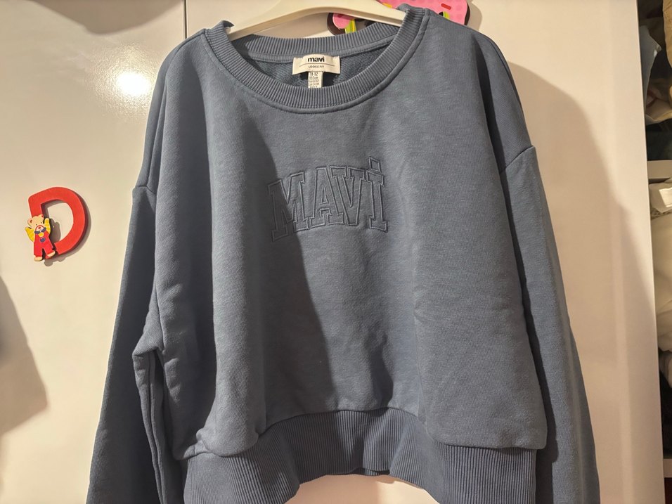 Gri, oversize kesim, bisiklet yaka ve uzun kollu sweatshirt. Nakışlı Mavi logosu ve örme detaylarıyla günlük kullanıma uygun.