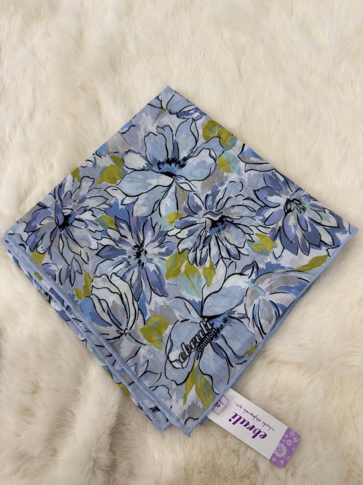 Kadınlara özel, gri mavi çiçek desenli, yumuşak sentetik kumaştan yapılmış fırfırlı şal. Rahat ve bohem tarz için uygun.