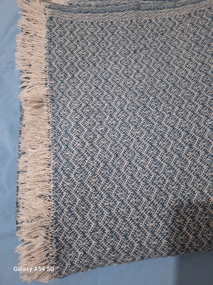 Püsküllü kenarları ve hafif dokulu gri-mavi tonlarda sade desenli yumuşak koltuk örtüsü.