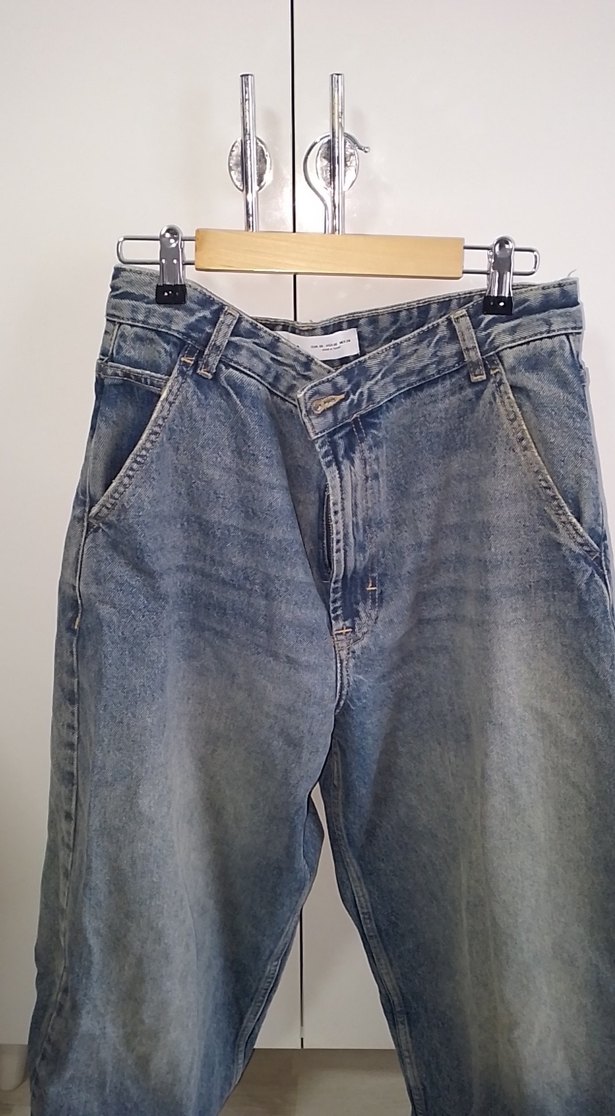 Gri mavinin tonlarında, salaş kesim, tokalı detaylı kadın kot pantolon. Günlük rahat kullanım için uygundur.
