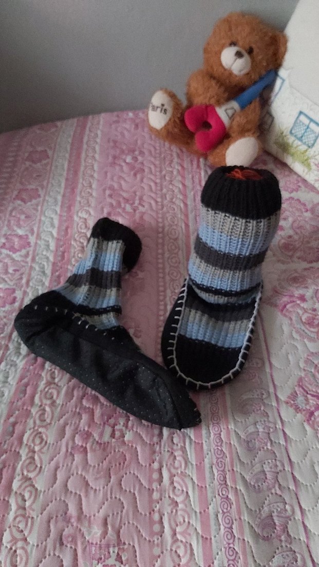 Yumuşak örgüden yapılmış, çizgili gri mavi siyah tabanlıklı ev çorabı, bohem ve goth tarzını yansıtarak evde sıcak tutar. 37 numaraya uygundur #çorap #patik #terlik #panduf