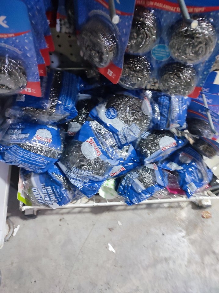 Gri ve mavi renklerde, zor kirleri temizlemek için kullanılan tel temizlik süngerleri, mavi ambalajda.