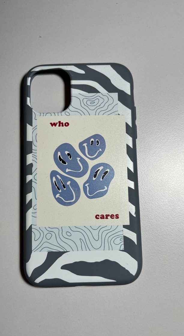 Gri ve mavi renklerde, 'who cares' yazılı, rahat ve şık karşı kültür tarzı telefon kılıfı.