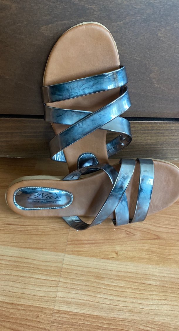 Gri mavi tonlarda, tokalı dolgu topuklu, minimalist ve bohem tarzda kauçuk kadın terlikler. Günlük kullanıma uygundur.