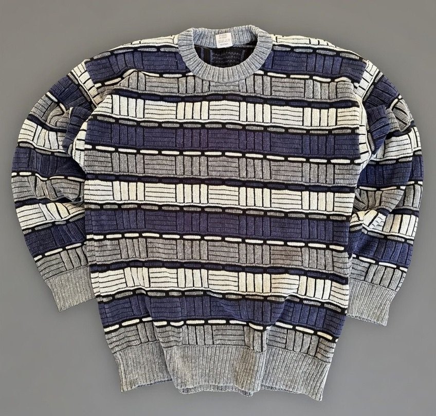 Gri-Mavi Tonlarında Bloklu Geometrik Şeritli Kazak. Ribbed doku ve kalın, sıcak tutan örgüsüyle inanılmaz retro bir parça. Beden: XLarge Durum: Temiz, vintage ürün