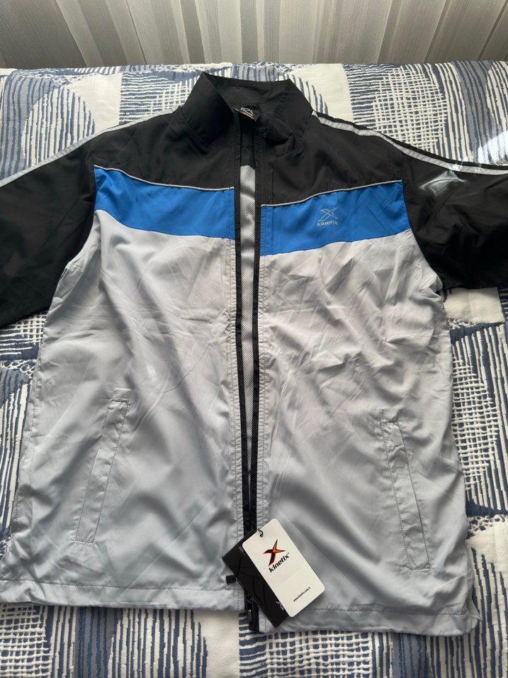 Erkekler için gri mavi renklerde uzun kollu, fermuarlı ve baskılı desenli sentetik kumaştan yapılmış normal boyda spor rüzgarlık. Rahat kesim ve çentikli yaka içerir.