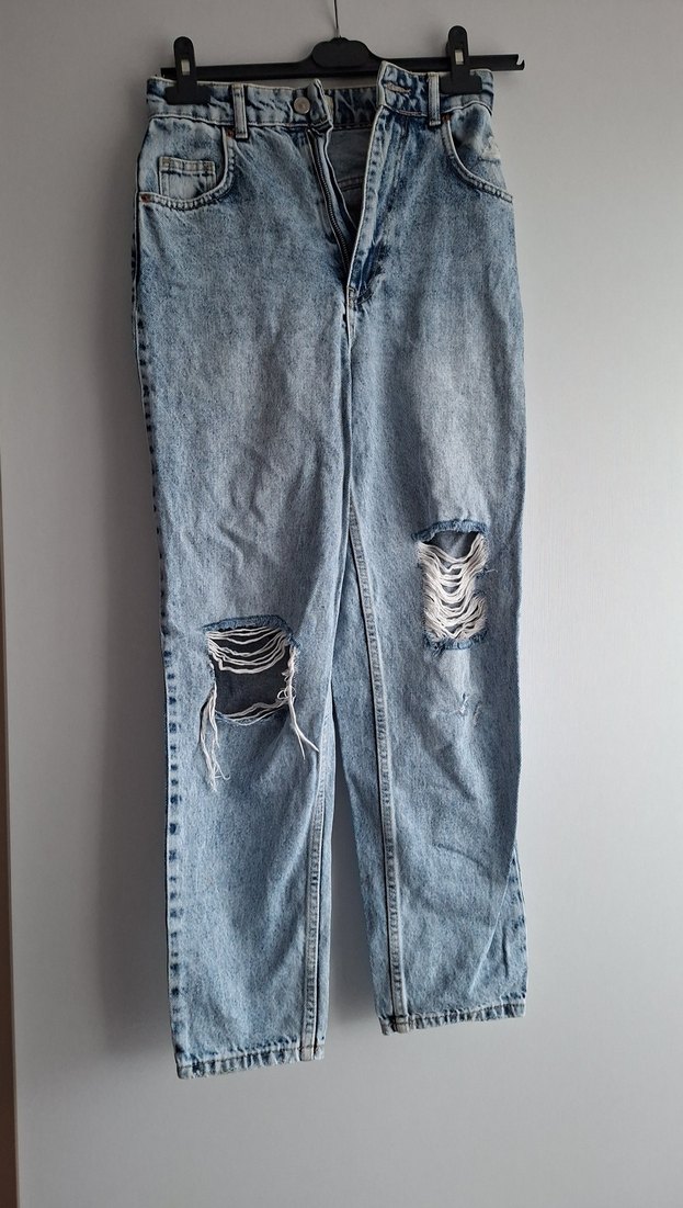 Gri mavi renkli, yırtık detaylı, bol kesim kadın denim pantolon. Midi boy ve kemerli, rahat sokak stiline uygun bir tasarım.