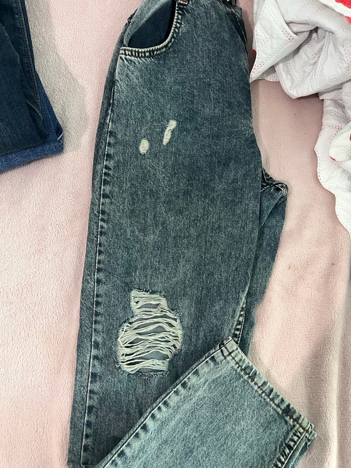 Gri-mavi denimden, yırtık ve yırtmaç detaylı, salaş kesim kadın jean. Günlük sokak stili için uygundur.