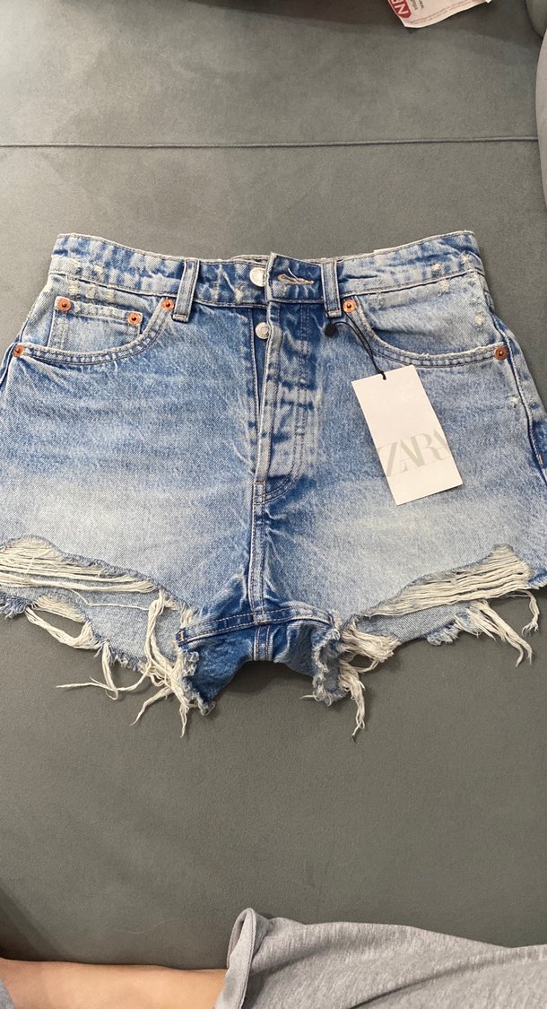 Gri Mavi Yırtık Mini Denim Şort